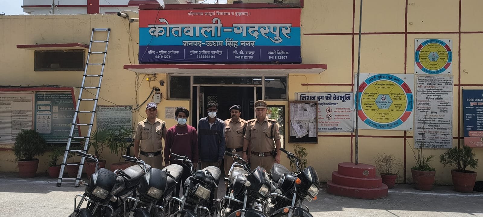 श्रीमान वरिष्ठ पुलिस अधीक्षक महोदय जनपद उधम सिह नगर द्वारा कोतवाली गदरपुर क्षेत्रान्तर्गत मोटर साईकिल चोरी की घटनाओं का शीघ्र अनावरण किये जाने हेतु कड़े निर्देश दिये गये थे। श्रीमान पुलिस अधीक्षक महोदय अपराध /पुलिस अधीक्षक महोदय काशीपुर जनपद उधम सिह नगर तथा क्षेत्राधिकारी महोदय बाजपुर के कुशल पर्यवेक्षण मे तथा प्रभारी निरीक्षक गदरपुर के नेतृत्व मे थाना पुलिस टीम त्वरित कार्यवाही करते हुए आज दिनांक 11-04-2026 को ऑपरेशन प्रहार चैकिंग अभियान के तहत दौराने चैकिंग एनएच-74 काशीपुर रोड में सरदारनगर फ्लाई ओवर से आगे श्मशान घाट के पास से दो संदिग्ध मो0सा0 सवार को रोका गया रोकने पर मो0सा0 को और तेजी भगाने लगे संदेह होने पर उपरोक्त मोटर साईकिल सवार को घेर घोटकर पकड़ा गया तो उक्त व्यक्ति द्वारा अपने नाम 1- विजय विश्वास पुत्र सुरेन्द्र विश्वास निवासी वार्ड नं0 03 चन्दनगढ थाना दिनेशपुर जिला ऊधम सिंह नगर उम्र 24 वर्ष व 2- आनन्द विश्वास पुत्र दुलाल विश्वास निवासी मोतीपुर नं0 02 थाना दिनेशपुर जिला ऊधम सिंह नगर उम्र 25 वर्ष बताया प्रयुक्त मो0सा0 को चैक किया गया तो उक्त मो0सा0 थाना गदरपुर में पंजीकृत मु0 FIR N0. 111/20256 धारा 303 (2) BNS से संबन्धित वादी मुकदमा की चोरी हुई मोटर साइकिल हीरो होण्डा सप्लेन्डर प्लस रजिस्ट्रेशन नं० UK06BB3002 होना पाया गया। सख्ती से पूछताछ करने पर अभियुक्त गण की निशादेही पर चोरी की अन्य 04 मोटर साईकिले सरदार नगर श्मशान घाट वाली रोड से आगे दाहिनी तरफ नाले के किनारे झाडियो से बरामद की गयी। गिरफ्तारशुदा अभियुक्त गण को माननीय न्यायालय के समक्ष पेश किया जा रहा है। अभियुक्त के विरुद्ध पूर्व में भी चोरी के अभियोग दर्ज है। अभियुक्त गण की आपराधिक इताहिस को देखते हुए अभियोग में संगठित अपराध की धारा 112 बी0एन0एसी0 की बढ़ोत्तरी की गयी है।