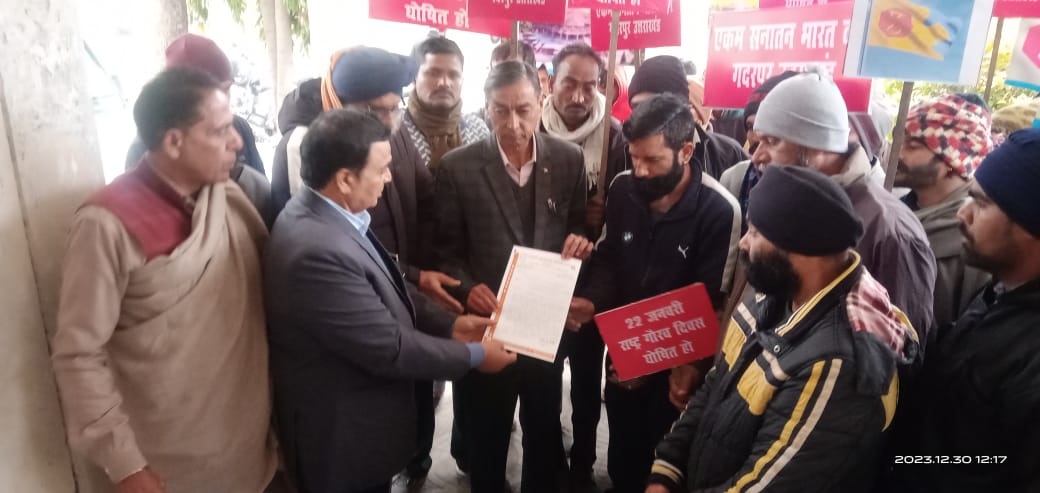 गदरपुर । एकम सनातन भारत दल के कार्यकर्ताओं ने जय श्री राम के उद्घोष के बीच 22 जनवरी को ‘राष्ट्र गौरव दिवस’ के रूप में मनाने के लिए माननीय प्रधान मंत्री को ज्ञापन भेजा।एकम सनातन भारत दल के कार्यकर्ता हाथों में तख्तियां लेकर तहसील परिसर में एकत्र हुए और जयश्री राम के नारों के बीच तहसील कार्यालय पहुंचे,जहां एकम सनातन भारत दल के प्रदेश उपाध्यक्ष डॉ.आर के महाजन के नेतृत्व में कार्यकर्ताओं ने तहसीलदार देवेन्द्र सिंह के माध्यम से प्रधानमंत्री महोदय को ज्ञापन भेजा । डॉ, महाजन ने ज्ञापन में मांग की है कि 22 जनवरी हिंदू समाज के लिए गौरव का दिन है ,22 जनवरी 2024 को श्री राम मंदिर का शुभारंभ होने जा रहा है जानकारी देते हुए उन्होंने कहा ,सन 1528 में मुगल आक्रमणकारी बाबर के सेनापति मीर बाकी द्वारा सम्राट विक्रमादित्य द्वारा अयोध्या में सरयू नदी के किनारे निर्मित करवाए गए भव्य राम मंदिर को तोड़कर मस्जिद का निर्माण करवाया था । हिंदू समाज के 500 वर्षों के सतत संघर्ष में असंख्य बलिदानों के फलस्वरुप माननीय उच्चतम न्यायालय के आदेश के बाद भव्य श्री राम मंदिर का निर्माण संभव हो पाया है उन्होंने कहा कि श्री राम मर्यादा पुरुषोत्तम है तथा भारत देश का गौरव है उन्होंने केंद्र सरकार से मांग की है कि 22 जनवरी को राष्ट्रीय गौरव दिवस पर सार्वजनिक अवकाश घोषित किया जाए । इस मौके पर डॉ, आरके महाजन,अमित ढींगरा,हरचरण सिंह ,मुकेश फोगाट,राजकुमार नैय्यर,गोपाल कश्यप,अमरीक सिंह,कुंवर सिंह, अजय रावत, सोनू सैनी,चेतराम सिंह, जसवंत सिंह सैनी ,पूरन कंबोज,अर्जुन रावत,अजय सैनी ,रमेश कंबोज ,नोनी राम सैनी,विपिन कश्यप सहित अन्य कार्यकर्ता मौजूद रहे ।