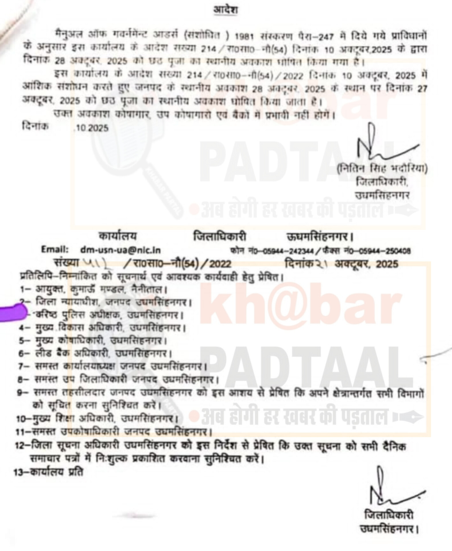 छठ का पर्व पूरे देश में बड़े ही धूमधाम से मनाया जाता है इसी के सापेक्ष में उत्तराखंड सरकार द्वारा भी 28 अक्टूबर को छठ के उपलक्ष में अवकाश की घोषणा की गई है।मैनुअल ऑफ गवर्नमेन्ट आडर्स (संशोधित) 1981 संस्करण पैरा-247 में दिये गये प्राविधानों के अनुसार इस कार्यालय के आदेश सख्या 214/रा०सा०- नी (54) दिनांक 10 अक्टूबर, 2025 के द्वारा दिनांक 28 अक्टूबर 2025 को छठ पूजा का स्थानीय अवकाश घोषित किया गया है।इस कार्यालय के आदेश सख्या 214/1०11०-नी (54)/2022 दिनाक 10 अक्टूबर, 2025 में आआंशिक संशोधन करते हुए जनपद के स्थानीय अवकाश 28 अक्टूबर 2025 के स्थान पर दिनांक 27 अक्टूबर, 2025 को छठ पूजा का स्थानीय अवकाश घोषित किया जाता है।उक्त अवकाश कोषागार, उप कोषागारो एवं बैंकों में प्रभावी नहीं होगें।