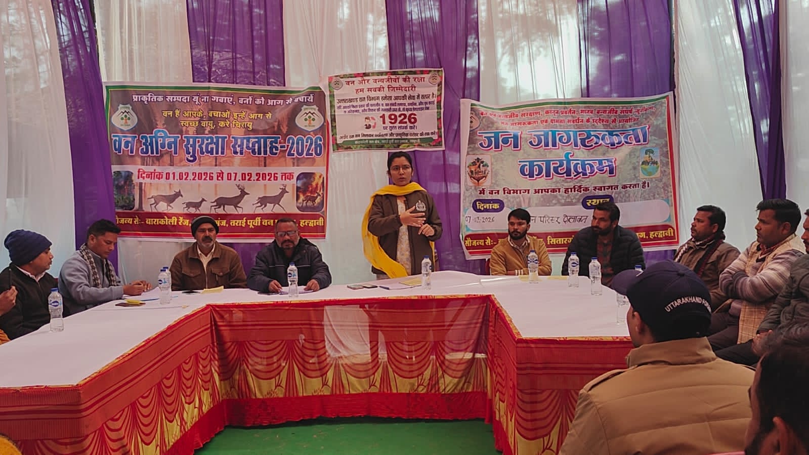 सितारगंज बाराकोली रेंज, सितागरंज के अन्तर्गत ढोलावन वन परिसर में वन एवं वन्यजीव संरक्षण, कानून प्रवर्तन, मानव-वन्यजीव संघर्ष न्यूनीकरण, जन जागरूकता एवं क्षमता संवर्धन के उद्देश्य से विभिन्न प्रशिक्षण कार्यक्रमों का आयोजन किया गया तथा वनाग्नि सुरक्षा सप्ताह -2026 मनाया गया। जिसमें ग्राम- शहदोरा, अलीनगर , वंगाली कलोनी , बरा , सेमलपुरा ग्रामीणों को वन्य जीव संघर्ष एवं वनाग्नि हेतु जागरूक किया गया। जनप्रतिनिधियों, ग्रामीणों, वन विभाग के अधिकारी एवं कर्मचारियों द्वारा इस अवसर पर पर्यावरण को बचाने एवं वनों को आग से बचाने हेतु प्रतिज्ञा भी ली गयी। इस अवसर पर सुश्री शिरीन, संजय पंडित, I.F.S प्रभारी वन क्षेत्राधिकारी, बाराकोली रेंज,, क्षेत्र पंचायत सदस्य, ग्राम प्रधान, सभासद, जनप्रतिनिधि, ग्रामीण एवं बाराकोली रेंज के कर्मचारीगण उपस्थित रहे।
