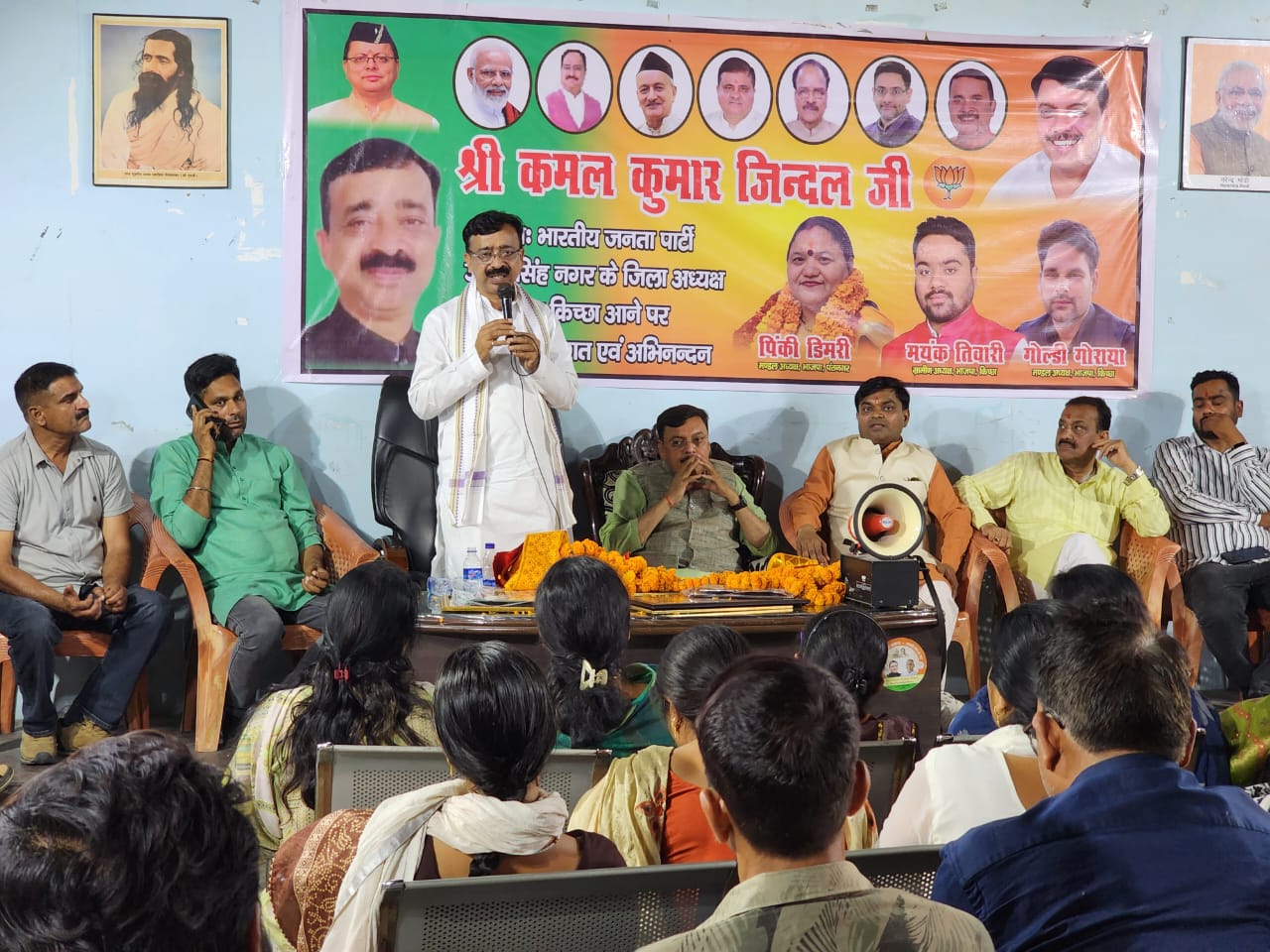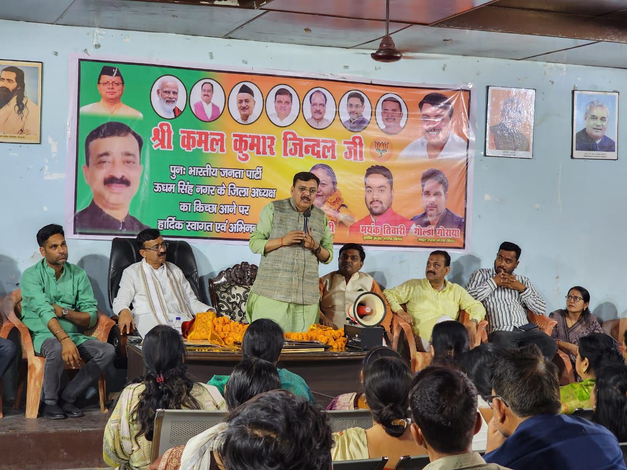 जिलाध्यक्ष कमल जिंदल ने अपने संबोधन में शीर्ष नेतृत्व का आभार व्यक्त करते हुए कहा कि पार्टी ने उन पर दोबारा विश्वास जताया है, जिसे वह पूरी निष्ठा से निभाएंगे। उन्होंने कहा कि पार्टी को सशक्त बनाने और आगामी विधानसभा चुनाव में भाजपा की जीत सुनिश्चित करने हेतु वे अपना शत-प्रतिशत योगदान देंगे। उन्होंने कहा कि यह स्वागत सभी समर्पित कार्यकर्ताओं का सम्मान है और उन्होंने भरोसा दिलाया कि वे सभी को साथ लेकर संगठन को और अधिक मजबूत करेंगे।कार्यक्रम को मंडल अध्यक्ष गोल्डी गोराया, पंतनगर मंडल अध्यक्ष पिंकी डिमरी, किच्छा ग्रामीण मंडल अध्यक्ष मयंक तिवारी, नगर पालिका अध्यक्ष नगला सचिन शुक्ला ने भी संबोधित किया। कार्यक्रम का संचालन मनमोहन सक्सेना ने किया।कार्यक्रम में वरिष्ठ भाजपा नेता सुरेश कोली, तरुण दत्ता, महेंद्र वाल्मीकि, संजीव खन्ना, धर्मराज जायसवाल, स्वतंत्र राय, संजीव सिंह, नारायण पाठक, विनोद कोली, देवेंद्र शर्मा, प्रकाश पंत, मुकेश कोली, जितेंद्र गौतम, मुरारी लाल, नीतू सिंह, सुशील मौर्य, सीमा रस्तोगी, मधु गुप्ता, पूजा राठी, श्याम बिष्ट, सुशील गंगवार, पूरन भट, ओम तनेजा, इमरान, अंकित पाठक, अमन कोली, असलम, भूरा, प्रताप सिंह, संजीव खन्ना, दिलीप जीना, जितेंद्र गुप्ता, अमरनाथ कश्यप, जानकी तिवारी, लता सिंह, करुना तिवारी, शैली फुटेला, सचिन, गफ्फार खान, राजेश तिवारी, नरेंद्र ठुकराल, ग्राम प्रधान दीपक मिश्रा, जोगिंदर सिंह जिंदू, विजेंद्र यादव, अनुसूचित मोर्चा जिला अध्यक्ष महेंद्र बाल्मीकि उपस्थित थे।