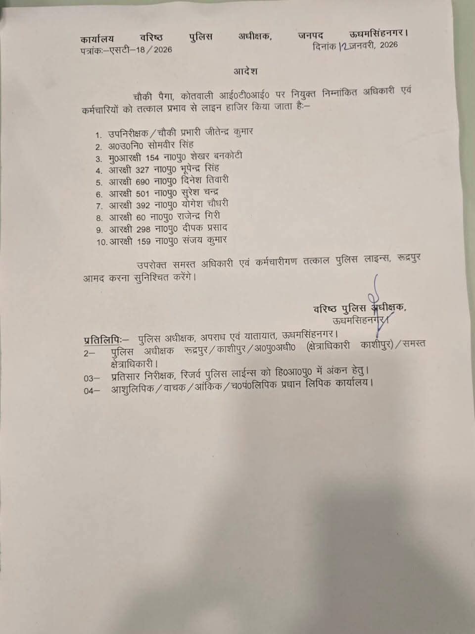 वहीं, चौकी पैगा, कोतवाली आईटीआई पर तैनात कुल 10 अधिकारी एवं कर्मचारियों को तत्काल प्रभाव से लाइन हाजिर किया गया है। सभी को पुलिस लाइन्स, रुद्रपुर में तत्काल आमद करने के निर्देश दिए गए हैं।लाइन हाजिर किए गए कर्मियों में शामिल हैं—उपनिरीक्षक/चौकी प्रभारी जितेन्द्र कुमार, अ०उ०नि० सोमवीर सिंह, मु०आरक्षी शेखर बनकोटी सहित कुल 10 पुलिसकर्मी। चौकी पैगा, कोतवाली आई०टी०आई० पर नियुक्त निम्नांकित अधिकारी एवं कर्मचारियों को तत्काल प्रभाव से लाइन हाजिर किया जाता है:-1. उपनिरीक्षक/चौकी प्रभारी जीतेन्द्र कुमार2. अ०उ०नि० सोमवीर सिंह3. मु०आरक्षी 154 ना०पु० शेखर बनकोटी4. आरक्षी 327 ना०पु० भूपेन्द्र सिंह5. आरक्षी 690 ना०पु० दिनेश तिवारी6. आरक्षी 501 ना०पु० सुरेश चन्द्र7. आरक्षी 392 ना०पु० योगेश चौधरी8. आरक्षी 60 ना०पु० राजेन्द्र गिरी9. आरक्षी 298 ना०पु० दीपक प्रसाद10. आरक्षी 159 ना०पु० संजय कुमारएसएसपी ऊधमसिंहनगर ने स्पष्ट किया है कि लापरवाही किसी भी स्तर पर बर्दाश्त नहीं की जाएगी और दोषी पाए जाने वालों पर कठोर कार्रवाई की जाएगी