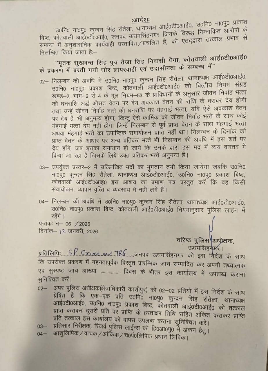 रुद्रपुर/ऊधमसिंहनगर:मृतक सुखवंत सिंह पुत्र तेजा सिंह निवासी पैगा, कोतवाली आईटीआई से जुड़े आत्महत्या प्रकरण में बरती गई घोर लापरवाही एवं उदासीनता को गंभीरता से लेते हुए वरिष्ठ पुलिस अधीक्षक ऊधमसिंहनगर ने बड़ी प्रशासनिक कार्रवाई की है।एसएसपी के आदेश पर उपनिरीक्षक ना०पु० कुन्दन सिंह रौतेला (थानाध्यक्ष आईटीआई) तथा उपनिरीक्षक ना०पु० प्रकाश बिष्ट (कोतवाली आईटीआई) को तत्काल प्रभाव से निलंबित कर दिया गया है।