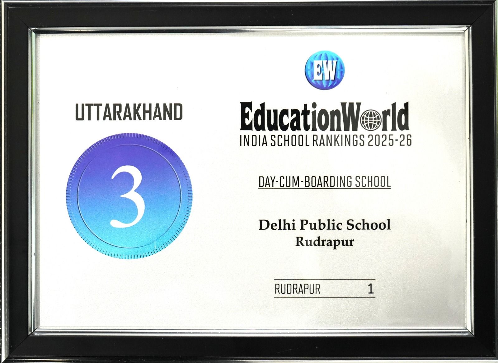 एजुकेशन वर्ल्ड संस्था द्वारा दिल्ली पब्लिक स्कूल, रुद्रपुर को पाँचवीं बार प्रोग्रेसिव व आधुनिक स्कूलों की श्रेणी में रुद्रपुर में प्रथम तथा उत्तराखंड में तीसरा स्थान