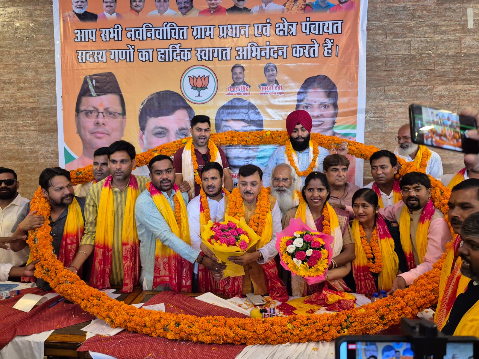 स्वागत समारोह में जेस्ट ब्लॉक प्रमुख संजय सिंह, कनिष्ठ ब्लॉक प्रमुख भारती देवी के साथ ग्राम प्रधान दीपिका देवी, पूजा कुमारी पूजा, तुलसी देवी, राहुल कुमार, रेखा, मनीषा, परवीन, निशा, नेमा, सोनी गंगवार, कुमारी रोली, कावल सिंह, मेहरबान सिंह, उस्मान, रविंदर गंगवार, छत्रपाल, बीरेंद्र यादव, आशीष यादव, तारा पांडे, नाजिया, बचुली देवी, कविता तिवारी, आबिद, नेहा, दीपा कांडपाल, मनविंदर सिंह, दीपक गिरी, अमन कश्यप, गुरमीत सिंह, शशि कला यादव, विनीत सिंह सोलंकी एवं क्षेत्र पंचायत सदस्य कुमारी नेहा, उषा देवी, शांति देवी, कृष्ण कुमार, सुनील, रोहित कुमार, रमेश चंद, रिजवाना, रुचि पाल, ज्योति मौर्य, माला देवी, नरेश कुमार, अमरजीत सिंह, विवेक कुमार, ललित राय, नितिन यादव, गंगा दानू, पूजा, शिवानी, सरोजिनी करकी, पूर्णिमा दानू, रीता ठुकराल, आरसी, हर्षित गुंबर, अंकित सिंह, रहमत खान, सुखजीत सिंह, सत्यभान, जयेंद्र पाल को अंगवस्त्र ओढ़ाकर सम्मानित किया। कार्यक्रम में मंडल अध्यक्ष किच्छा ग्रामीण मंडल मयंक तिवारी, किच्छा नगर मंडल अध्यक्ष गोल्डी गोरया, बरा मंडल अध्यक्ष सत्यभान, मनमोहन सक्सेना, धर्मराज जायसवाल, नरेंद्र मणि त्रिपाठी, योगेंद्र मणि त्रिपाठी, नारायण पाठक, संदीप अरोड़ा, मूलचंद राठौर, कुलदीप बग्गा, महामाया मिश्रा, नीरज द्विवेदी, राकेश सिंह, तरुण दत्ता, अनिल चौहान, सुशील यादव, रोशन अरोड़ा, बंटी खुराना, रोहित कलरा, इंद्र मेहता, अंकित पाठक, बिजेंद्र यादव, नरेंद्र ठुकराल, मंगत चुग, हरीश कलरा, जसमीत कक्कड़, भारत मिश्रा, मोहन तिवारी, यमन अंसारी, राकेश यादव, मनोज यादव समेत सैकड़ो कार्यकर्ता उपस्थित थे।