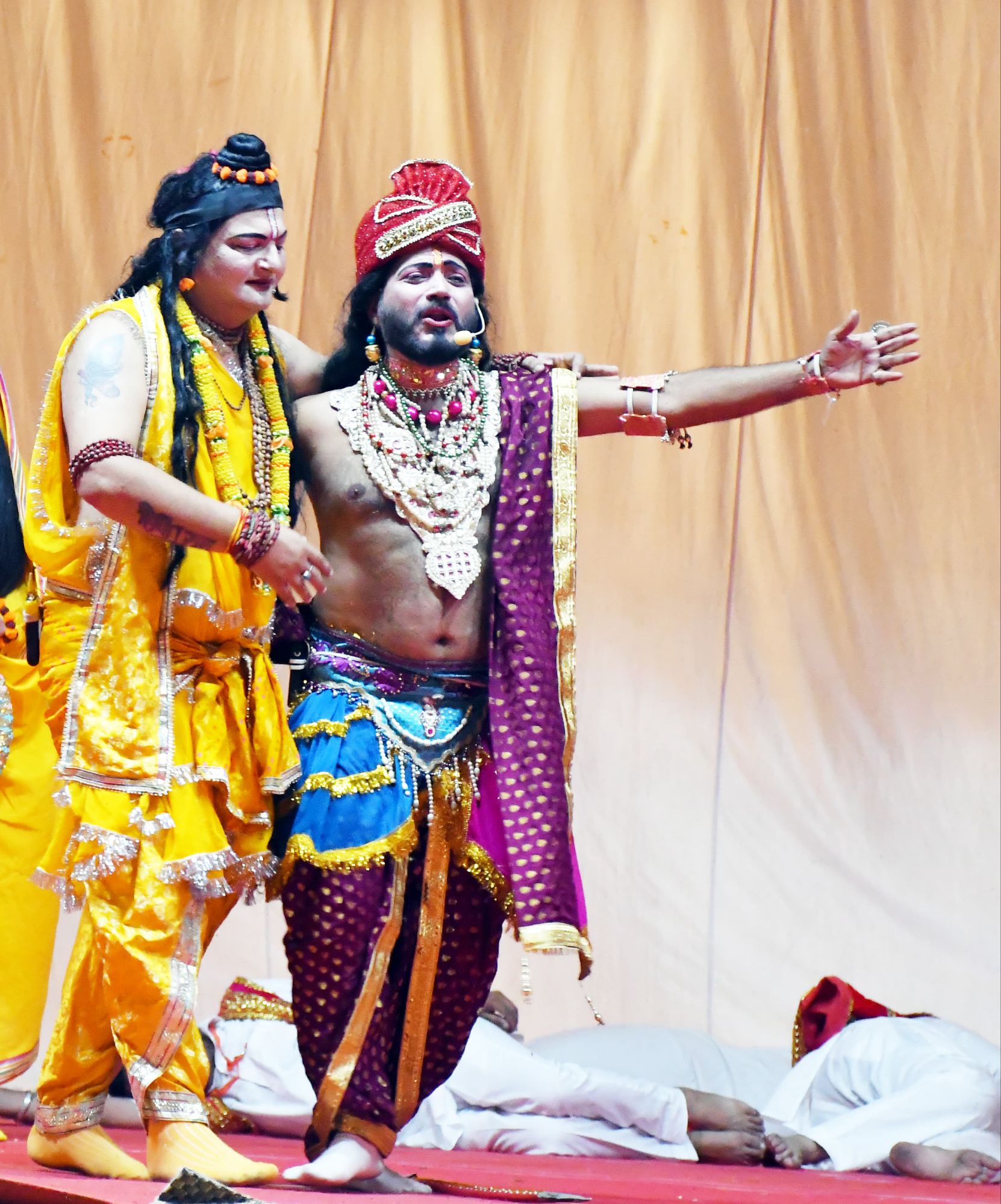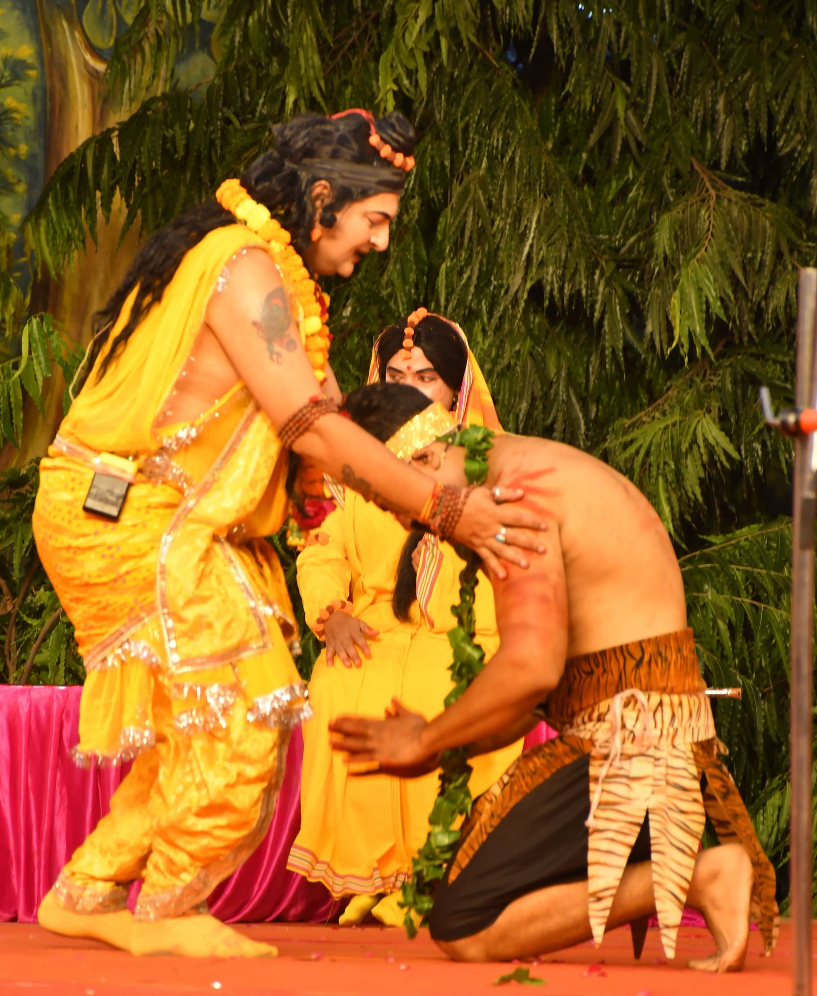 बाक्स 001 भील राजा गुह के दल ने समां बांधा भील राजा गुह एवं रामचन्द्र जी की मुलाकात से पूर्व भील राजा गुह एवं उनके दल नें ागृति आदिवासी नृत्य कर पूरा समां ही बांध दिया। इस दृश्य में दल के बच्चों की शानदार वेशभूषा, नृत्य शैली के स्टैप्स को बखूबी सराहा गया। राजा गुह का अभिनय कर रहे कलाकार वैभव भुड्डी ने बताया कि इस पूरे आदिवासी नृत्य के दृश्य की तैयारी एक माह से कोरियोग्राफर के निर्देशन में चल रही थी। राजा गुह के दल में प्रमुख रूप से मोहन अरोरा, अक्ष अग्रवाल, हर्ष अरोरा, पुरुराज बेहड़, शौर्य अरोरा, अग्रिम सचदेवा, सक्षम दुआ, आयुष धमीजा, शिवांश कोहली, राजा आदि थे।