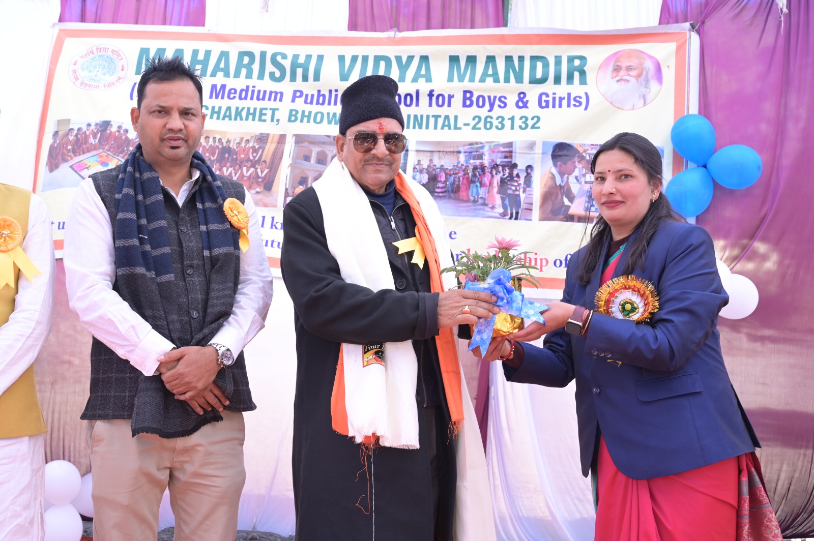 भवाली। महर्षि विद्या मंदिर भवाली का वार्षिकोत्सव समारोह मंगलवार को हर्षोल्लास के साथ सम्पन्न हुआ कार्यक्रम के मुख्य अतिथि पूर्व केंद्रीय राज्य मंत्री एवं नैनीताल उधमसिंहनगर सांसद अजय भट्ट रहे मुख्य अतिथि ने सांसद अजय भट्ट ने दीप प्रज्वलन कर कार्यक्रम का शुभारंभ किया। इस अवसर पर विद्यालय के छात्र छात्राओं द्वारा सरस्वती वंदना कुमाऊँनी एवं पंजाबी लोकनृत्य सहित विविध सांस्कृतिक प्रस्तुतियाँ दी गईं जिन्हें उपस्थित अभिभावकों एवं अतिथियों ने सराहा विद्यालय की प्रधानाचार्य साधना जोशी ने कार्यक्रम में उपस्थित अतिथियों का बैज अलंकरण व पुष्पगुच्छ भेंट कर स्वागत करने के साथ ही विद्यालय की वार्षिक प्रगति रिपोर्ट प्रस्तुत की अपने संबोधन में सांसद
