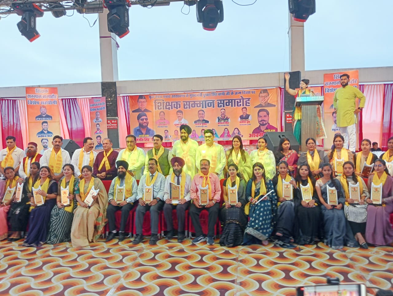 गदरपुर । प्रदेश के मुख्यमंत्री पुष्कर सिंह धामी के जन्मदिन की पूर्व संध्या पर शिक्षक समारोह का आयोजन नगर के बुध बाजार स्थित श्री सनातन धर्म मंदिर सभागार में करते हुए शिक्षा के क्षेत्र में जुड़े 850 से अधिक लोगों को स्मृति चिन्ह देकर सम्मानित किया गया। सोमवार की सायंकाल सभासद परमजीत सिंह और रजत कुमार अश्विनी द्वारा आयोजित कार्यक्रम का शुभारंभ ब्लॉक प्रमुख ज्योति ग्रोवर, भाजपा प्रदेश मंत्री गुंजन सुखीजा, पालिकाध्यक्ष मनोज गुंबर, नगर पंचायत गूलरभोज अध्यक्ष सतीश चुग और दिनेशपुर नगर पंचायत चेयरपर्सन मनजीत कौर ने संयुक्त रूप से द्वीप प्रज्वलित कर किया ।