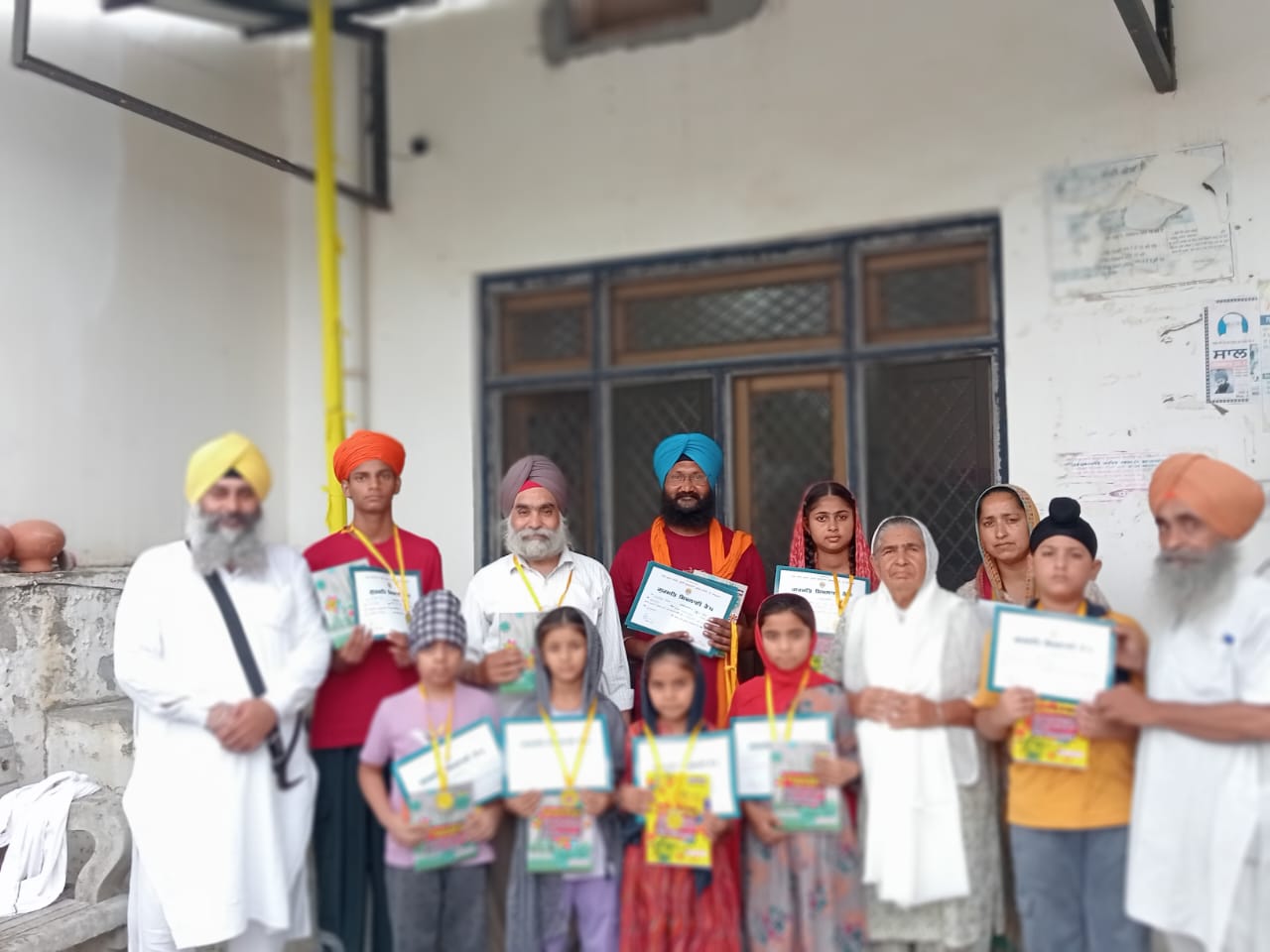 गदरपुर । ग्राम मकरंदपुर स्थित गुरुद्वारा साहिब में गुरबाणी चेतना एवं गुरमुखी अक्षर ज्ञान कंठस्थ किए जाने के लिए लगाए गए 20 दिवसीय गुरमत प्रशिक्षण शिविर के समापन के उपरांत बच्चों को श्री गुरु रामदास ट्रस्ट सेवा ट्रस्ट द्वारा उपलब्ध कराई गई कॉपियां एवं स्मृति चिन्हों का वितरण किया गया। वही गुरुद्वारा साहिब की वायु वयोवृद्ध मुख्य सेवादार माता हरबंस कौर को सम्मानित किया। इस दौरान एसजीपीसी उत्तराखंड के काशीपुर प्रचारक भाई हरजिंदर सिंह, शिक्षक जगजीत सिंह एवं सिख मिशनरी कॉलेज लुधियाना की गदरपुर इकाई के संचालक देवेंद्र सिंघ द्वारा माता हरबंस कौर को सेवा कार्य के 30 वर्ष पूरे होने पर शाल ओढ़ाकर सम्मानित किया गया। इस दौरान भाई हरजिंदर सिंह द्वारा भाई मनी सिंह जी के शहीदी पर प्रकाश डालते हुए कहा गया कि धर्म की रक्षा की खातिर उन्होंने अपने शरीर के टुकड़े-टुकड़े कटवा कर शहादत का जाम पिया और श्री अमृतसर दरबार साहिब की मर्यादा की रक्षा की वहीं देवेंद्र सिंघ द्वारा पर्यावरण संरक्षण एवं स्वस्थ जीवन के लिए गुरबाणी अनुसार जीवन जीने का तथा कुदरत के नियमों का पालन करने का आह्वान किया । कार्यक्रम के समापन पर एसजीपीसी द्वारा उपलब्ध कराए गए मेडल एवं प्रमाण पत्रों का वितरण किया गया । इस मौके पर गुरजीत कौर ,मनप्रीत कौर,हरबंस कौर मनदीप कौर,रमनप्रीत कौर, एशप्रीत कौर,गुरबाज सिंह, जसमीत कौर, गुरकीरत सिंह, अगमजोत सिंह,मनकीरत सिंह, बलविंदर सिंह,प्रभजोत सिंह सहित अन्य संगत